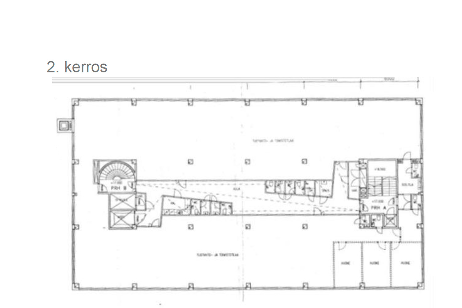 - Jokaisessa kerroksessa avointa toimistotilaa ja osittain jo jaettuja tiloja pienempiin kokonaisuksiin. Pinta-ala/kerros yhteensä noin 800 m² ja jokaisessa kerroksessa muutama avokeittiö ja useita wc tiloja. Vielä vapaana olevat tilat sijaitsevat 2. ja 3. kerroksissa ja ne ovat jaettavissa 2-3 käyttäjälle alkaen 150 m².