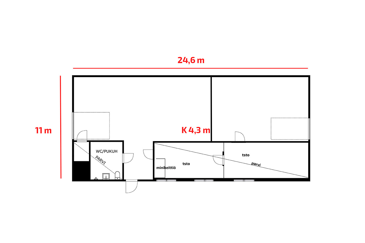 Rakennuksesta noin puolet on vuokrattuna ja puolet on heti vapaana. Rakennuksen tiloissa nyt vuokralla oleva yritys on halukas jatkamaan vuokralaisena samoilla hinnoilla ja ehdoilla. Kysy alivuokrausjärjestelyistä lisää. Mikäli uusi omistaja haluaa vain puolet rakennuksesta omaan käyttöön on tässä hyvä mahdollisuus saada kiinteistön kuluja jaettua.