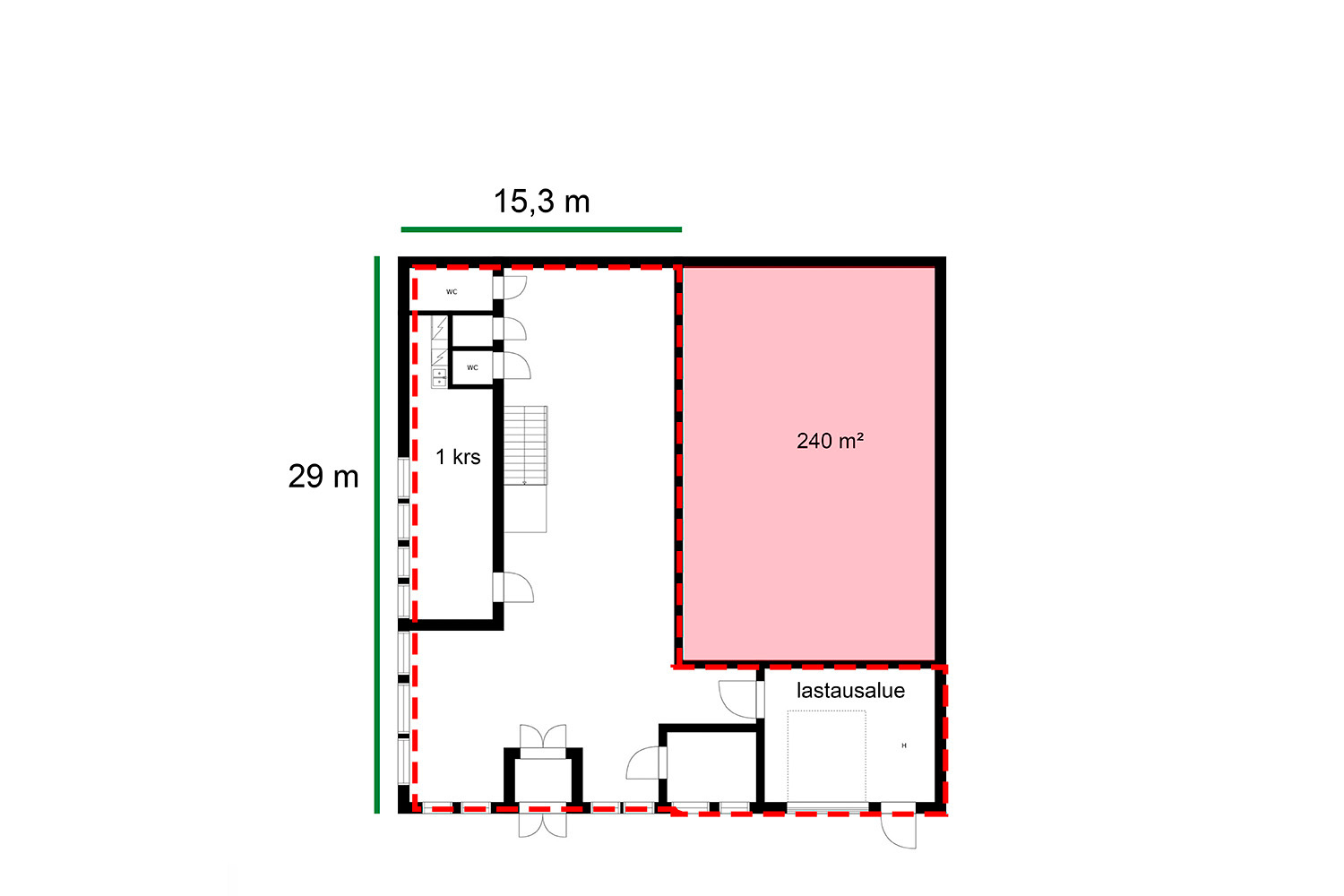 Huoneistoselitelmä: Iso myymälä-/hallitila, keittiö, wc, yhteiskäytössä olevassa lähettämössä nosto-ovi, varastotilaa, iso piha-alue
