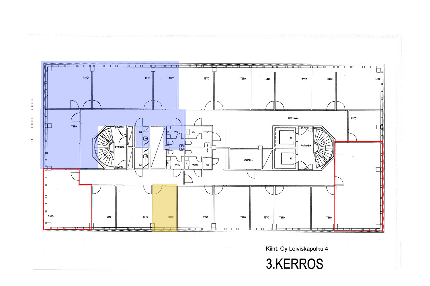Huone sijaitsee ison toimistorakennuksen tiloissa ja on pinta-alaltaan 143 m² (merkitty pohjaan sinisellä). Huoneisto on rakennuksen kolmannessa kerroksessa ja sisäänkäynti Leiviskäpolun puolelta. Rakennuksessa on hissi. Siisti ja valoisa rappu ja toimistohuoneessa isot ikkunat. Toimistohuoneiden lisäksi tiloissa on myös siisti keittiö ja WC. Siistit pinnat ja hyväkuntoinen tila.