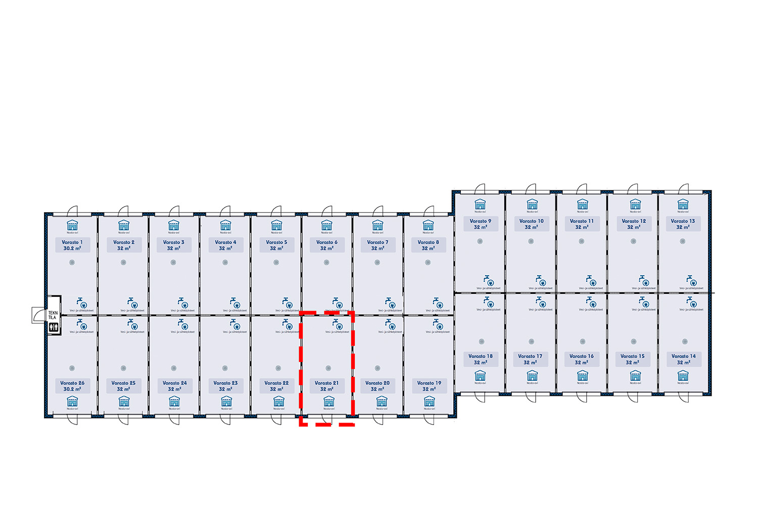 Kunto, varusteet ja palvelut: Hyvä tila, lattiakaivo, nosto-ovi, vesipiste, voimavirta, wc- ja suihkuvaraus, yhteis-wc
