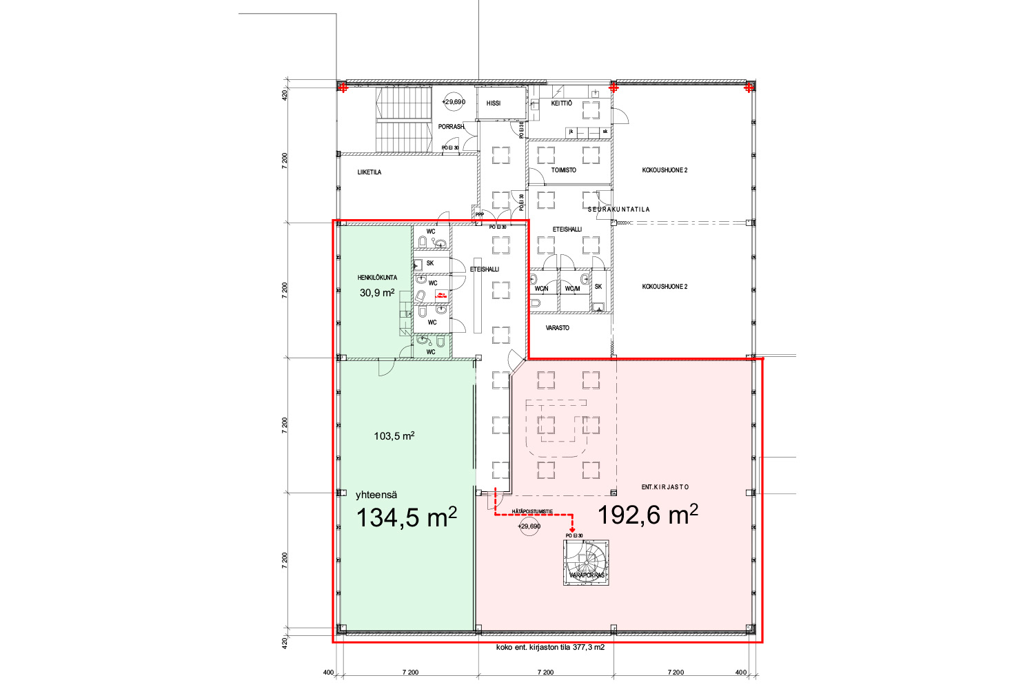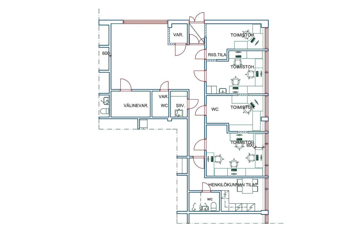 Kunto, varusteet ja palvelut: Peruskuntoinen tila. Keittiö, WC, suihku, henkilöhissi, toimistohuoneita, varastohuoneita, siivouskomero