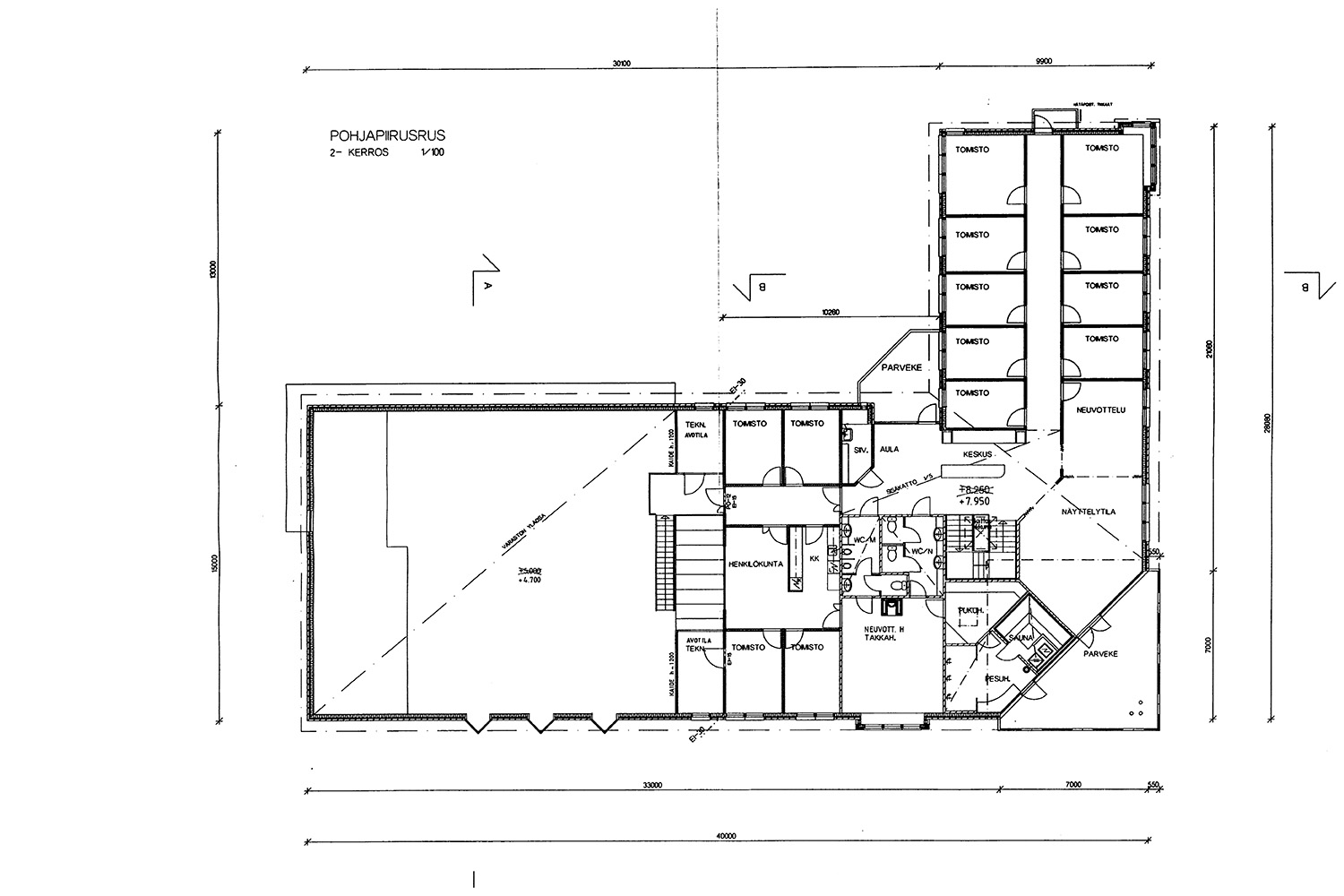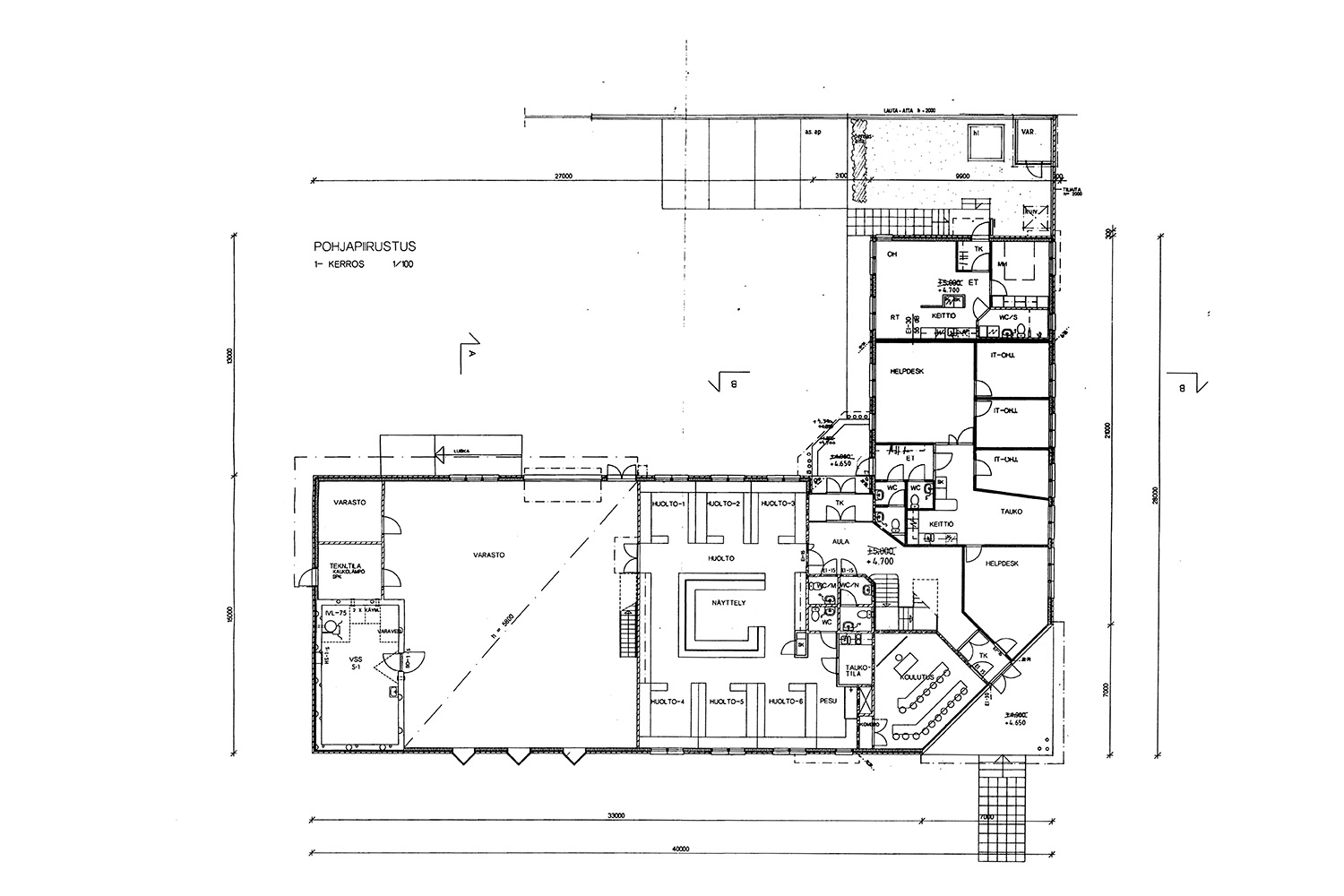 Huoneistoselitelmä: Varastoa, tuotantotilaa, toimistoa, saunaosasto ja asunto