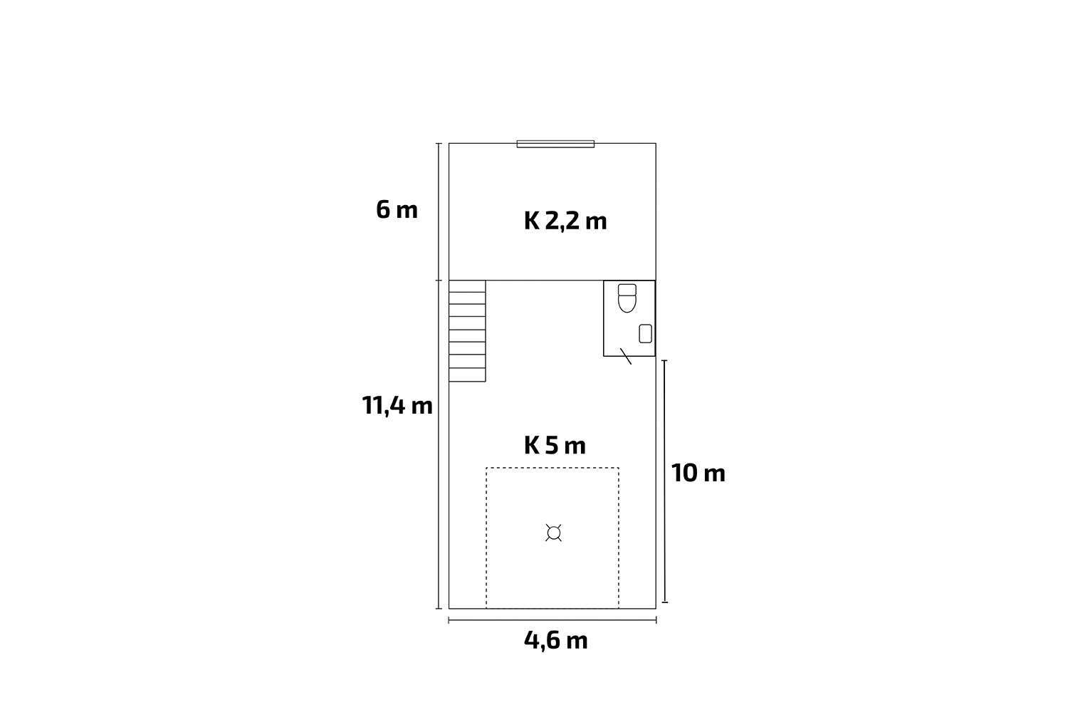 Hallin perällä on toinen kerros, jossa on 4,6 metriä leveä ja 6 metriä syvä taukotila. Korkeutta toisessa kerroksessa on 2,2 metriä. Hallin leveys on 4,6 metriä, syvyys 11,5 metriä ja korkeus 5 metriä. Toisen kerroksen edessä lattiatasossa on WC ja sen etuseinästä nosto-oveen on 10,0 metriä.