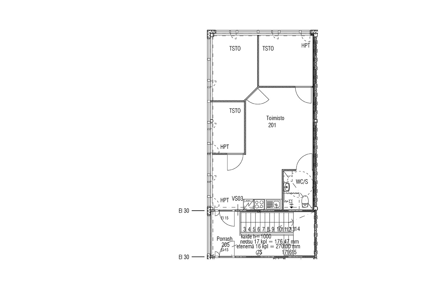 Noin 57 m²:n tilassa on kolme toimistohuonetta, keittiö sekä wc. Lämmitys sisältyy toimiston vuokraan, vesi ja sähkö laskutetaan erikseen mitatun kulutuksen mukaan. Huoneistossa viilennys ja lämmitys ilmalämpöpumpulla.