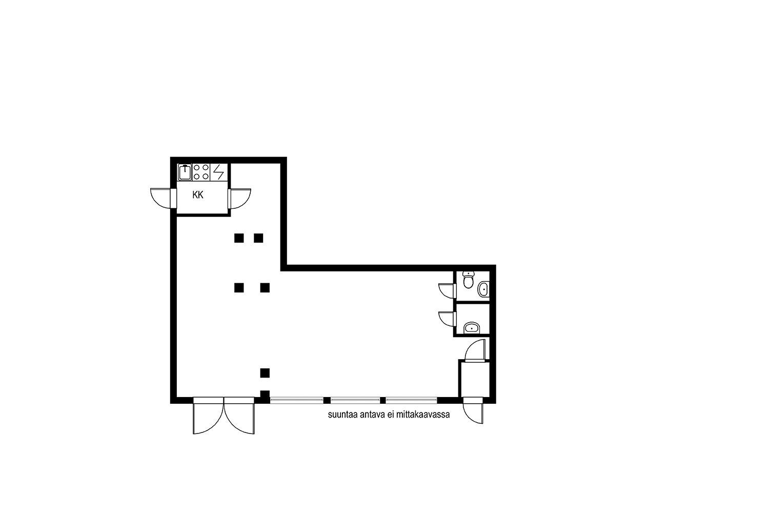 Huoneistoon on plussana kaksi sisäänkäyntiä. Käyntioven lisäksi pariovi mahdollistaa autolla ajon sisään tai lavatavaran sisään tuomisen. Oven mitat ovat L2,3xK1,95 metriä.